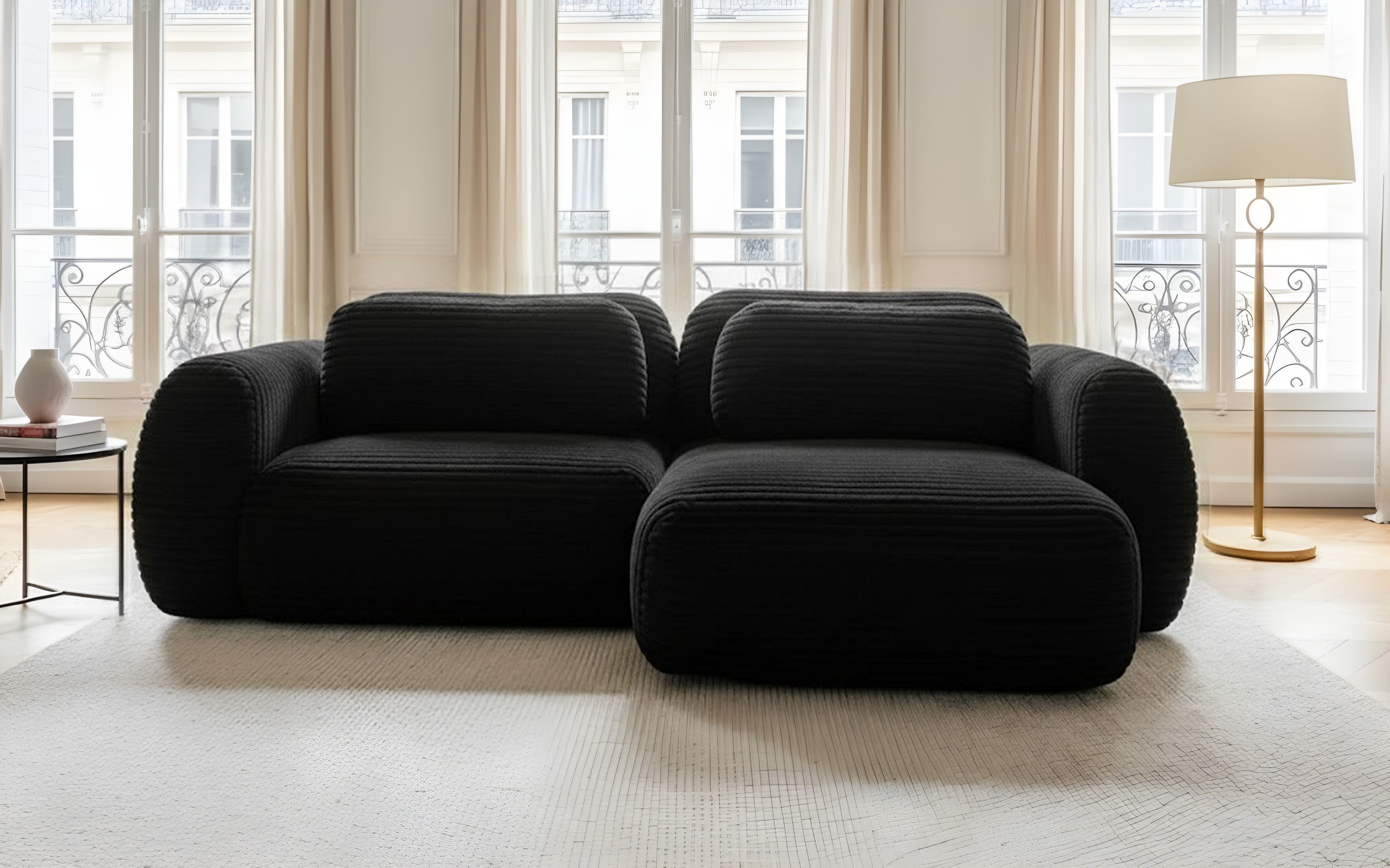 Dos tapissé : revêtement identique à l’avant, pour une installation libre au centre de la pièce