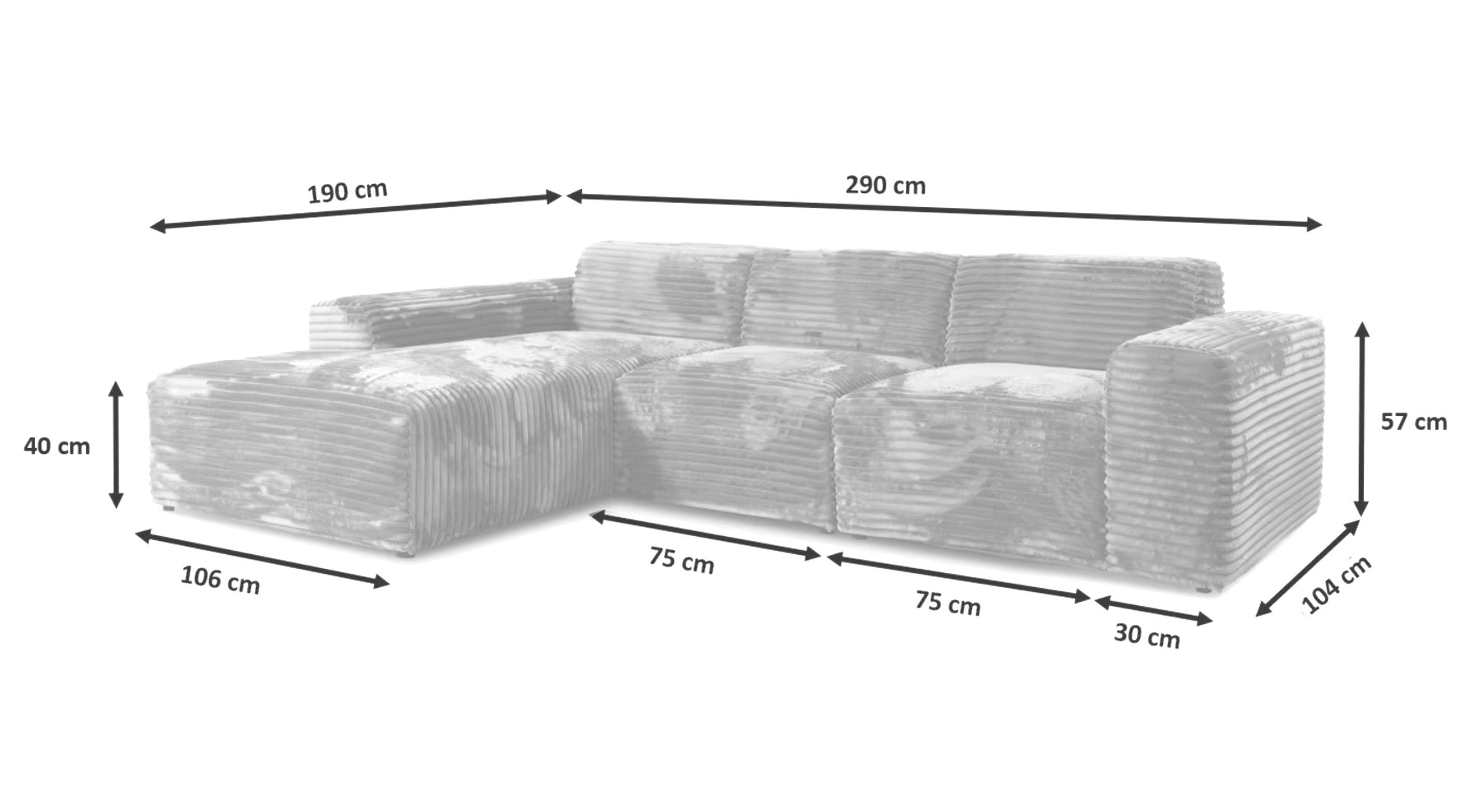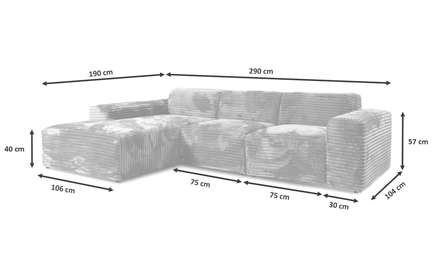 Dimensions : longueur 290 cm, profondeur méridienne 190 cm, hauteur totale 69 cm, hauteur assise 40 cm