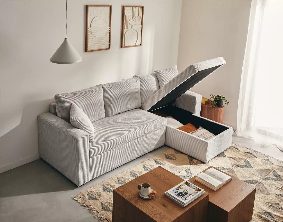 Pratique et fonctionnel, NOVA intègre un tiroir coulissant transformable en lit d’appoint ainsi qu’un coffre de rangement discret sous la méridienne. Idéal pour accueillir vos invités ou organiser vos accessoires, il combine confort, esthétisme et modularité pour devenir le cœur chaleureux et fonctionnel de votre intérieur.