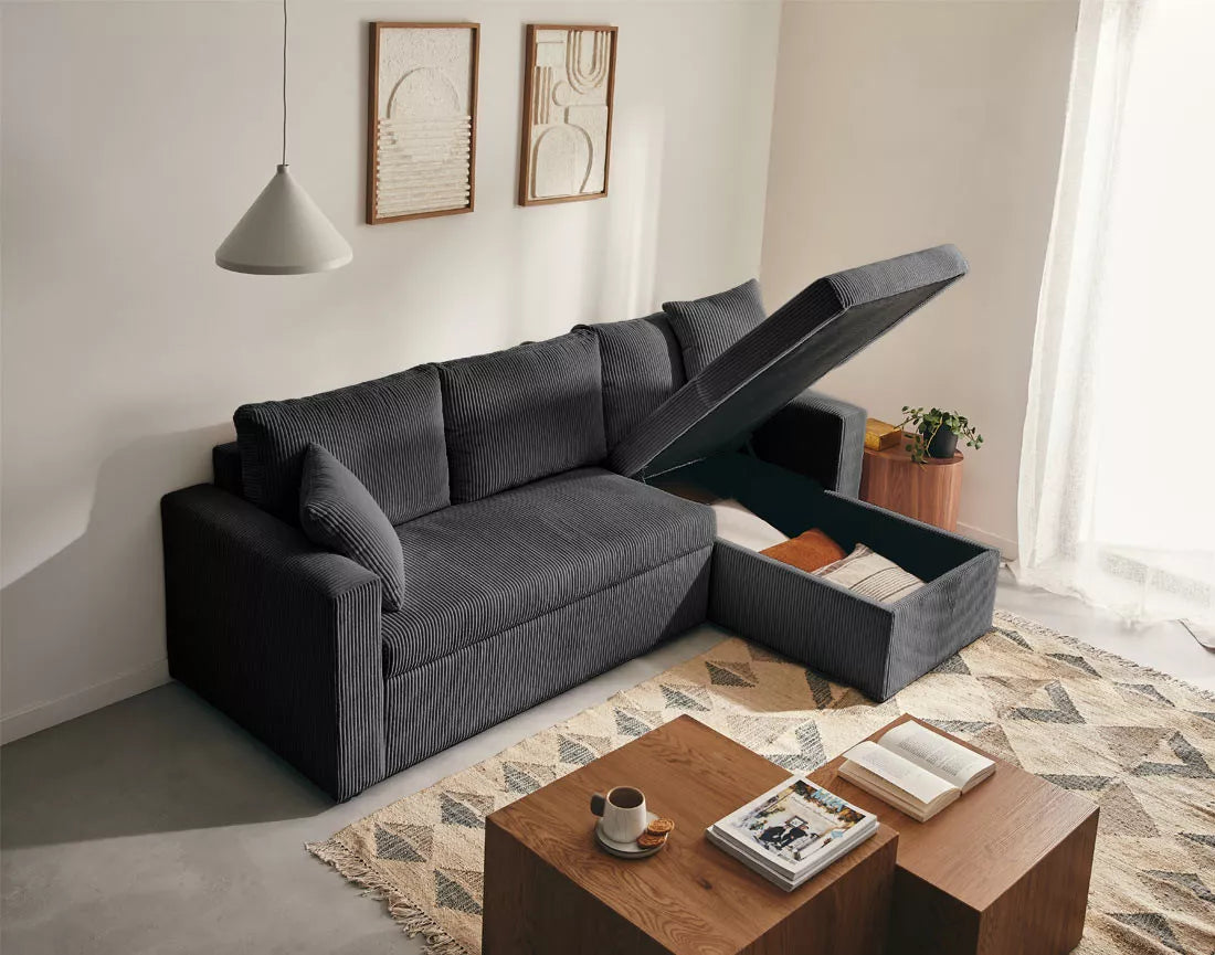 Convertible : tiroir coulissant sous l’assise centrale transformable en lit d’appoint confortable